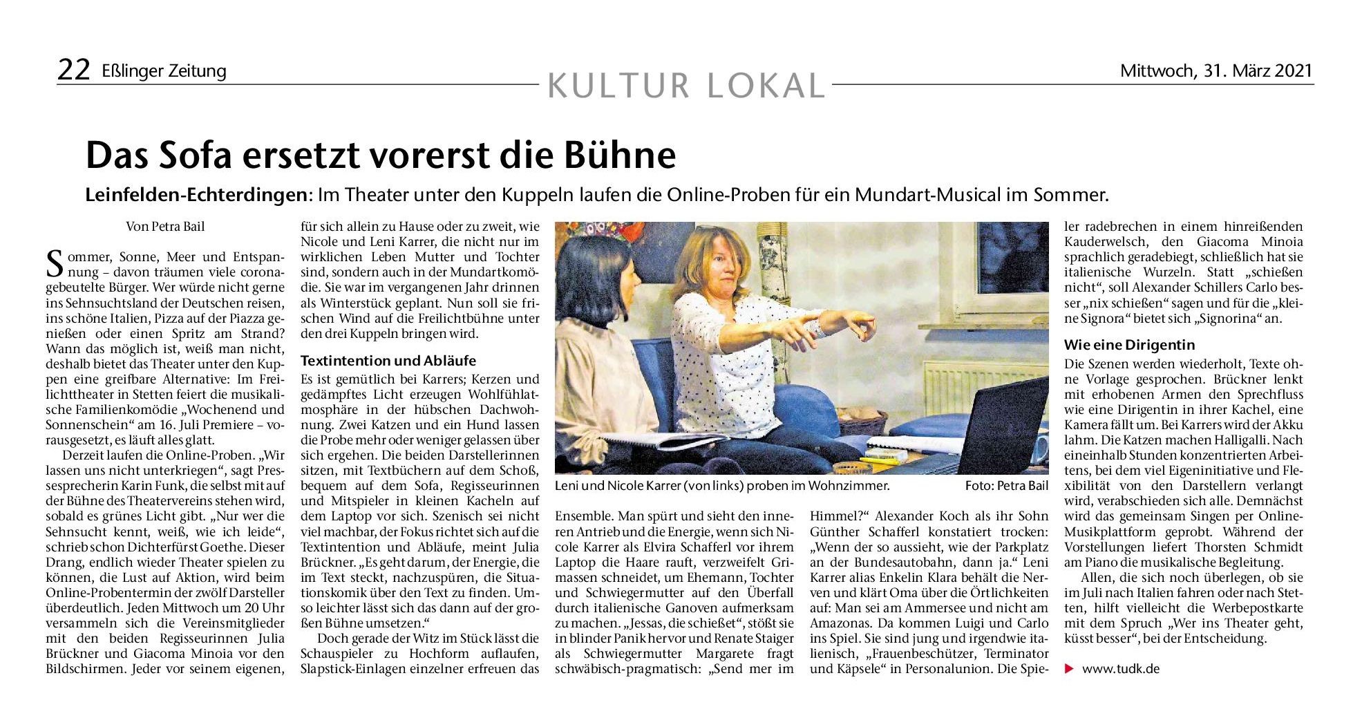 Sommer, Sonne, Meer und Entspannung - davon träumen viele coronagebeutelte Bürger. Wer würde nicht gerne ins Sehnsuchtsland der Deutschen reisen, in schöne Italien, Pizza auf der Piazza genießen oder einen Spritz am Strand? Wann das möglich ist, weiß man nicht, deshalb bietet das Theater unter den Kuppeln eine greifbare Alternative: Im Freilichttheater in Stetten feiert die musikalische Familienkömödie "Wochenend und Sonnenschein" am 16. Juli Premiere - vorausgesetzt es läuft alles glatt...