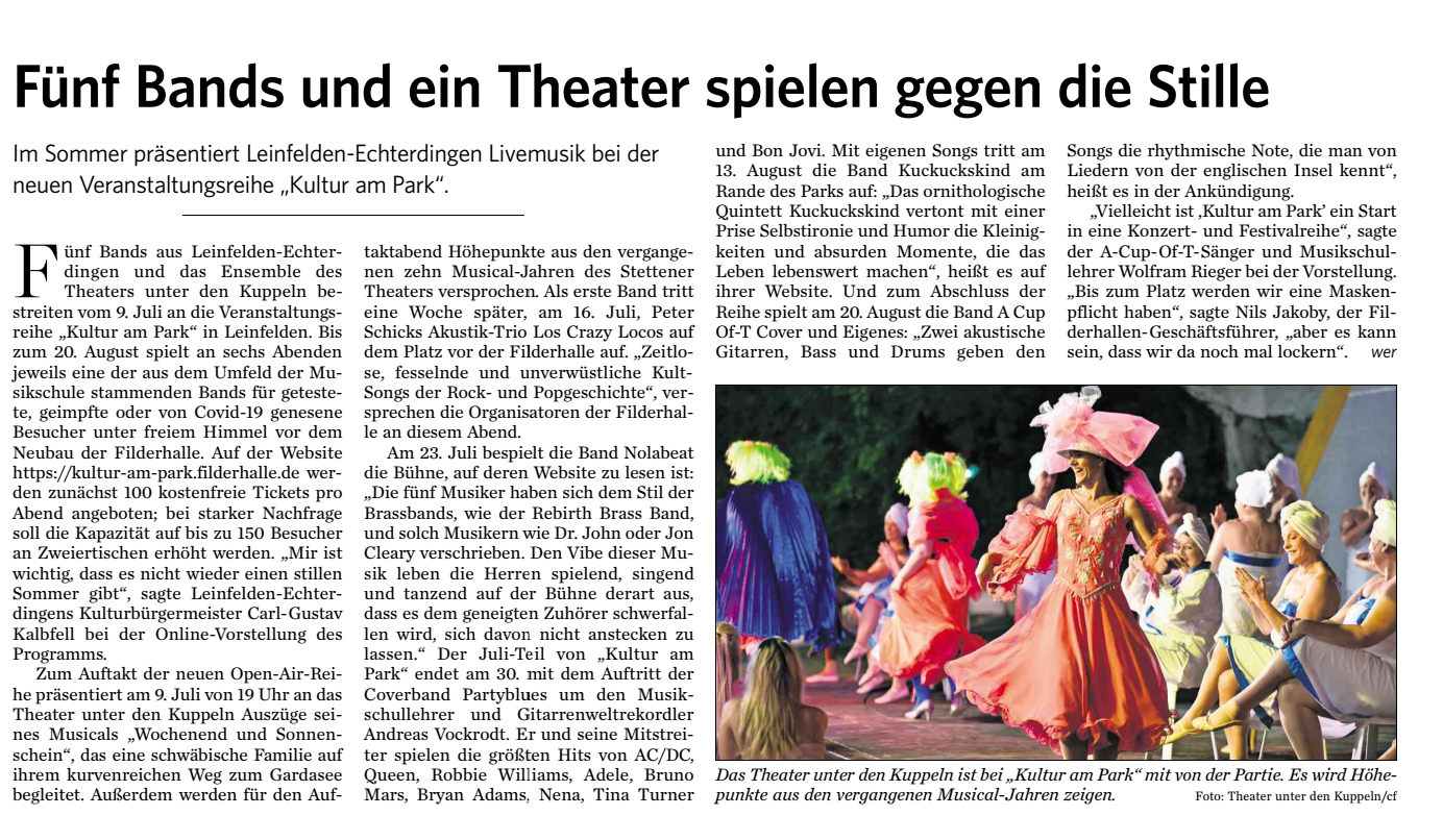 Fünf Bands aus Leinfelden-Echterdingen und das Ensemble des Theaters unter den Kuppeln bestreiten vom 9. Juli an die Veranstaltungsreihe "Kultur am Park" in Leinfelden. Bis zum 20. August spielt an sechs Abenden jeweils eine der aus dem Umfeld der Musikschule stammenden Bands [...] unter freiem Himmel vor dem Neubau der Filderhalle.