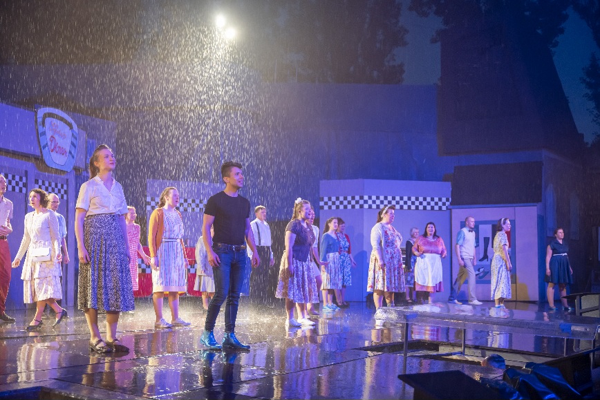 Den Schwung aus der 1. Premiere mitnehmend, hat das Ensemble auch bei der 2. Premiere am Samstag, 8. Juni, mit großer Spielfreude den Erfolg des ersten Abends wiederholt. Stoisch und durch die vielen Regenproben abgehärtet, ignorierte man nasse Stühle und schmiss sich ohne die Miene zu verziehen in die Pfützen. Eine große Herausforderung sind in diesem Jahr die vielen schwungvollen Choreographien, von den Tänzerinnen und dem Ensemble mit viel Schweiß in vielen Proben erlernt, geprobt und jetzt mit viel Freude auf die trockene oder nasse Bühne gebracht. Wir freuen uns über die positive Resonanz, die wir von unserem großartigen Premierenpublikum bekommen haben und wünschen uns und unseren Zuschauern in den nächsten Wochen viele schöne laue und trockene Sommerabende in denen wir sie in eine kleine amerikanische Stadt der 50ger Jahre entführen dürfen. Lachen, leiden und freuen Sie sich mit uns und auf einen Besuch in Sylvias Diner, eine Führung durch Miss Sandras Museum, eine Busfahrt mit Dennis, einen Abend auf dem Rummelplatz und auf die Irrungen und Verwirrungen, bis jeder Topf den richtigen Deckel gefunden hat. Wir spielen bei jedem Wetter, bis einschließlich 9. August, immer Freitag und Samstag, außer am Uff d' Wies Wochenende. Karten erhalten Sie unter www.tudk.de oder direkt an der Theaterkasse, Dienstag und Freitag von 15.00 bis 18.00 Uhr.