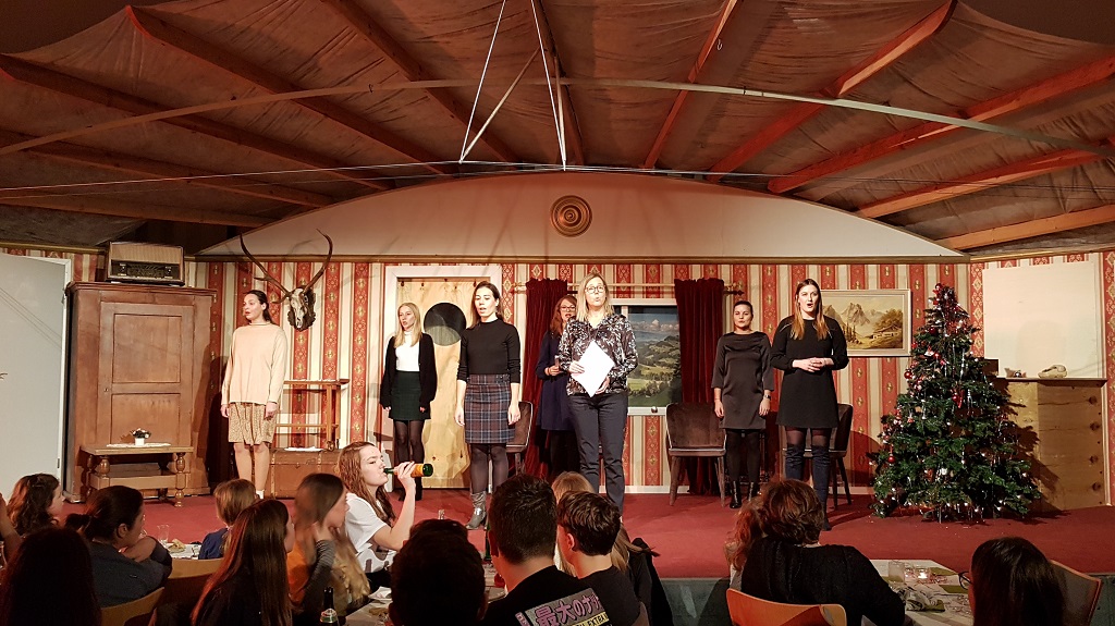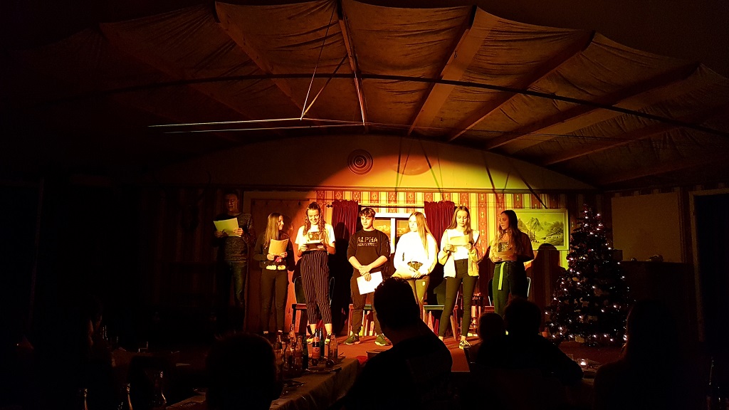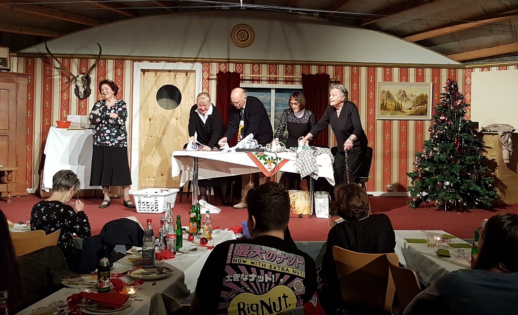 Nach den Ehrungen erwartete die 135 hungrigen Gäste ein Buffet mit vielen leckeren Salaten und vielem mehr, welches keine Wünsche offen ließ. So gestärkt wurden wir von der Theatergruppe „Nirosta“ mit einem heiteren Theaterstück unterhalten, bei dem zu guter Letzt eine schwungvolle Bügeleinlage mit 4 Bügeleisen und der Satz des Abends „Du zündest jetzt die Kerzen an, an Pfingsten ist es zu spät“ für laute Lacher gesorgt hat. Im Anschluss wurden wir von besinnlichen und lustigen Weihnachtsgedichten, vorgetragen von der Jugendgruppe und einer stimmungsvollen A-Capella-Gesangseinlage von sechs unserer jungen Sängerinnen unter der Leitung von Julia Brückner wunderbar unterhalten. Aber nicht genug, zum guten Schluss durften die Anwesenden noch erfahren, warum Maria trotz aller Bemühungen von Josef, dem Jesuskind, Ochs, Esel, Hirten, Schafen und den 3 Weisen aus dem Morgenland, einem Rauschgoldengel und Ralf Brückner, einfach nicht glücklich ist – wer es wissen möchte und bei der von Zina Sielaff und Madeleine Klenk und der Jugendgruppe wunderbar vorbereiteten Weihnachtsfeier nicht dabei sein konnte, muss einfach einen der Dabeigewesenen fragen…