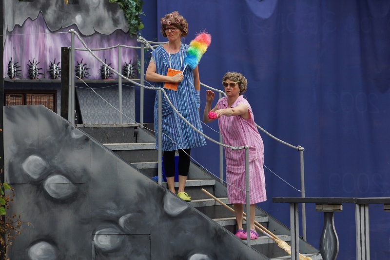 Was für ein Gewusel am vergangenen Sonntag – im Theater unter den Kuppeln haben sich Petrus, Judas, Donald Trump, Touristen, Marktfrauen, Stoffhändler, Angela Merkel und unsere Putzfrauen, Frau Kunzle und Frau Karrle, auf der Via Dolorosa getroffen und im Anschluss wurde die Bühne durch Hühner, Bienen und Blumen bevölkert , von Piraten geentert und sogar Sterne haben durch den Regen geleuchtet. Es gab Silberlinge, Pailletten und viel Glitzer und Glamour auf der Bühne, denn mit zwei Theatergottesdiensten in Kooperation mit der Evang. Kirchengemeinde Stetten und zwei ausverkauften Soiréen der Tanzschule des Theaters summte und brummte es den ganzen Tag im Gräbleswiesenweg und die vielen Besucherinnen und Besucher wurden zuerst nach Jerusalem und dann nach Charleston entführt. Trotz Regen blieben auch viele Gäste nach dem ersten Gottesdienst im Theatergarten und ließen sich Pommes und Currywurst schmecken, musikalisch begleitet vom Musikverein Stetten.