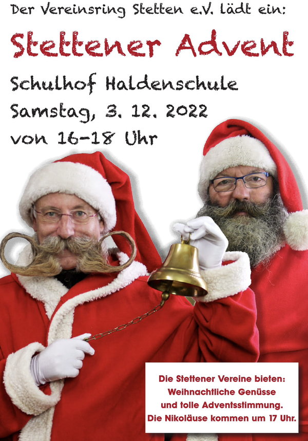 Bei leckerem Glühwein, Glühmost, alkoholfreien Kinderpunsch und Angeboten aus fernen Ländern treffen sich Bürgerinnen und Bürger aus Stetten und darüber hinaus. Ein guter Einstieg für neu Hinzugezogene, um in Stetten heimisch zu werden. Die zwei besinnlichen Stunden werden gerne genutzt, sich kennenzulernen, neue Pläne zu schmieden und sich einfach mal wiederzutreffen. Zu Beginn spielt die Jugendkapelle des Musikvereins Stetten. Das Theater singt Weihnachtslieder und die Karawane zeigt eine Lichtshow. Im Jugendforum ist Tag der offenen Tür und es gibt Bastelangebote. Und für unsere kleinen Besucher kommen die beiden Nikoläuse.